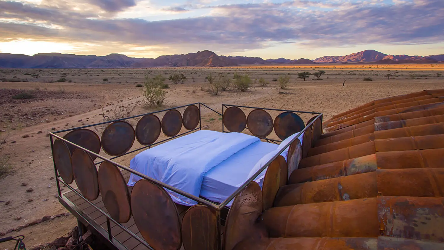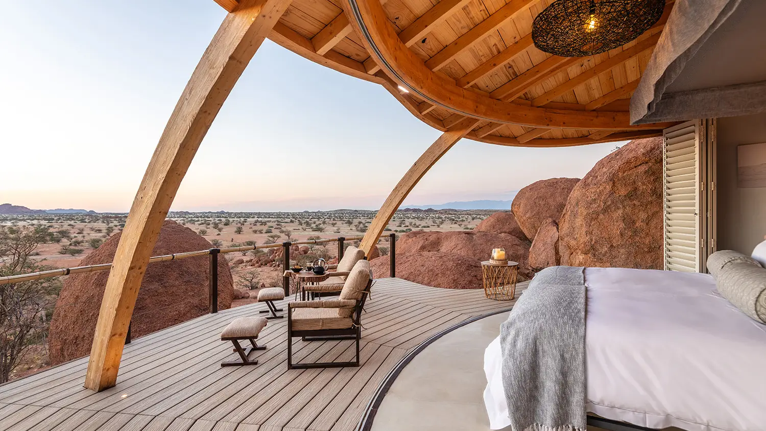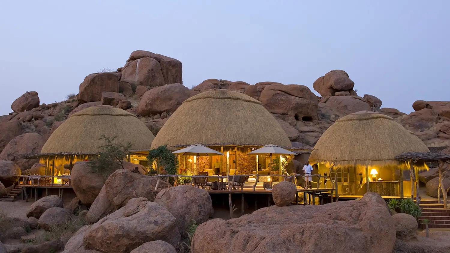 L’Etendeka Mountain Camp, au cœur du Damaraland, offre une immersion en pleine nature. Accessible uniquement en véhicule tout-terrain, ce camp écologique privilégie l’authenticité et la sobriété. Des randonnées guidées permettent de découvrir collines volcaniques, vallées arides et rivières asséchées. La faune y est abondante : oryx, girafes et koudous. Le soir, sous un ciel constellé, le calme absolu et la beauté des paysages procurent un sentiment rare de liberté et de communion avec la nature.
