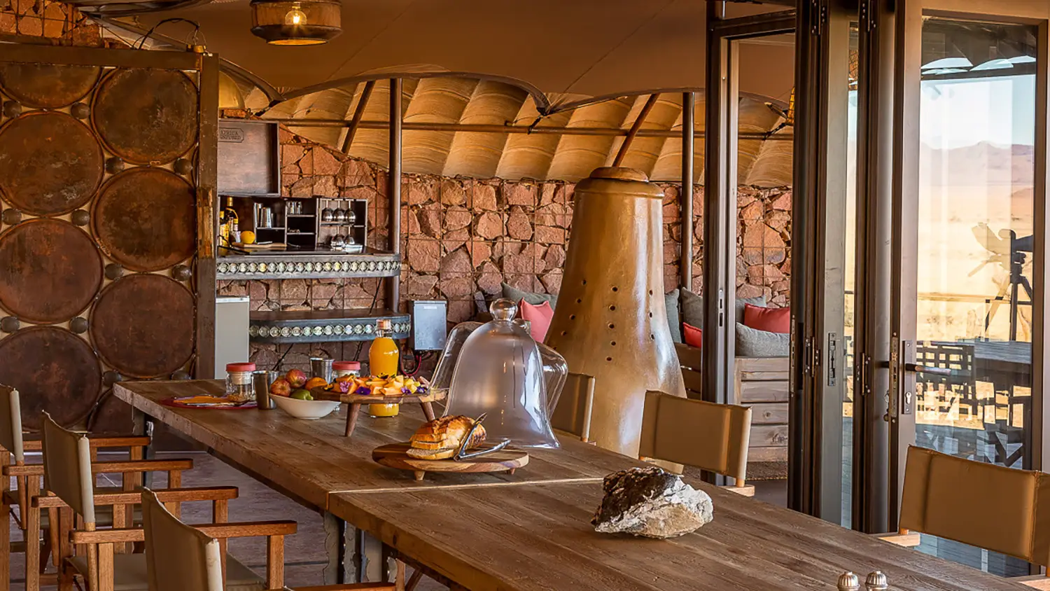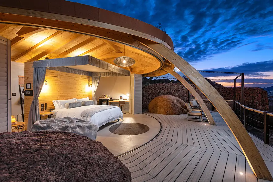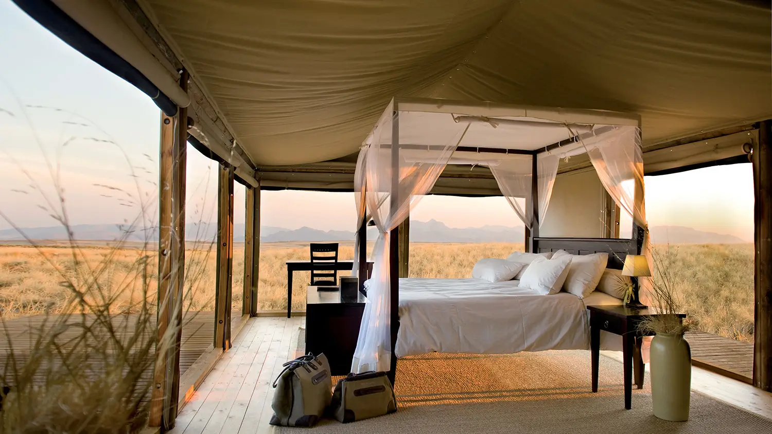 L’Etendeka Mountain Camp, au cœur du Damaraland, offre une immersion en pleine nature. Accessible uniquement en véhicule tout-terrain, ce camp écologique privilégie l’authenticité et la sobriété. Des randonnées guidées permettent de découvrir collines volcaniques, vallées arides et rivières asséchées. La faune y est abondante : oryx, girafes et koudous. Le soir, sous un ciel constellé, le calme absolu et la beauté des paysages procurent un sentiment rare de liberté et de communion avec la nature.
